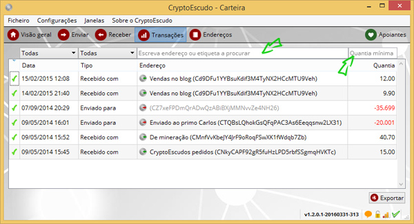 Depois de ter os seus primeiros movimentos de entrada e saída com a carteira CryptoEscudo, pode fazer consultas, usando diferentes filtros, na opção de "Transações" da sua carteira. Pode, por exemplo usar um filtro de um endereço CryptoEscudo, para que a carteira lhe mostre o histórico dos movimentos relativos a esse endereço em específico, ou um filtro de uma qualquer quantia, para que a carteira lhe mostre as transações com valor superior ou igual a essa quantia. Os filtros que podem ser preenchidos estão assinalados na imagem abaixo.